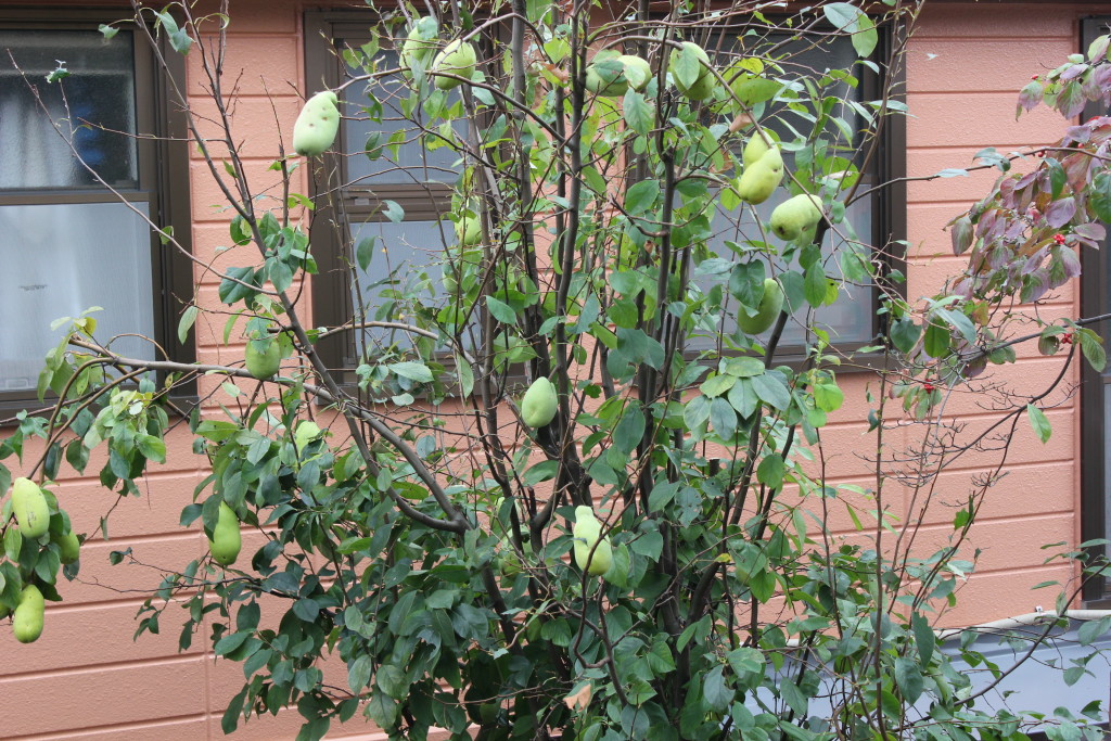 んで、ぜひとも我が家の庭にカリンをともう10年以上経ってる。実は成らないし、背は高くなるし、もう伐採しようかと思ってたらなんとこんな状態に豊作なんです。実のつき方が面白いですよね。