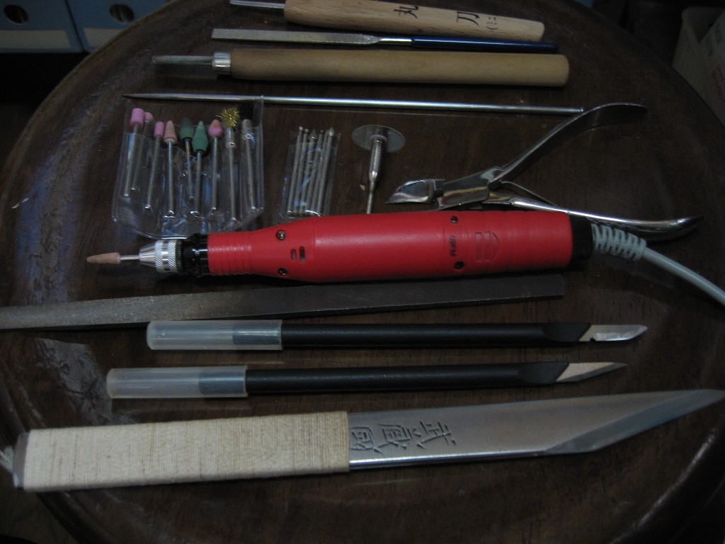他に彫刻刀、やすり、手作りの畳針、そんで新しく購入したのが真ん中の「ミニルーター」これは面白い!アタッチメントを使いこなすと実にいい!。ただ10分使用5分休憩としいうのがなんとも使いにくい。
